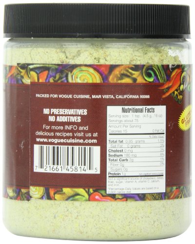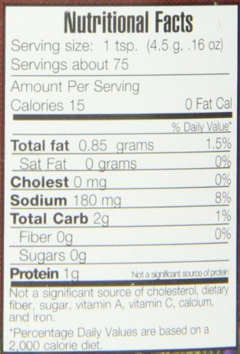 - 12oz jar = 75 Servings, 15 Calories per cup (Sodium Content per serving: 180mg)