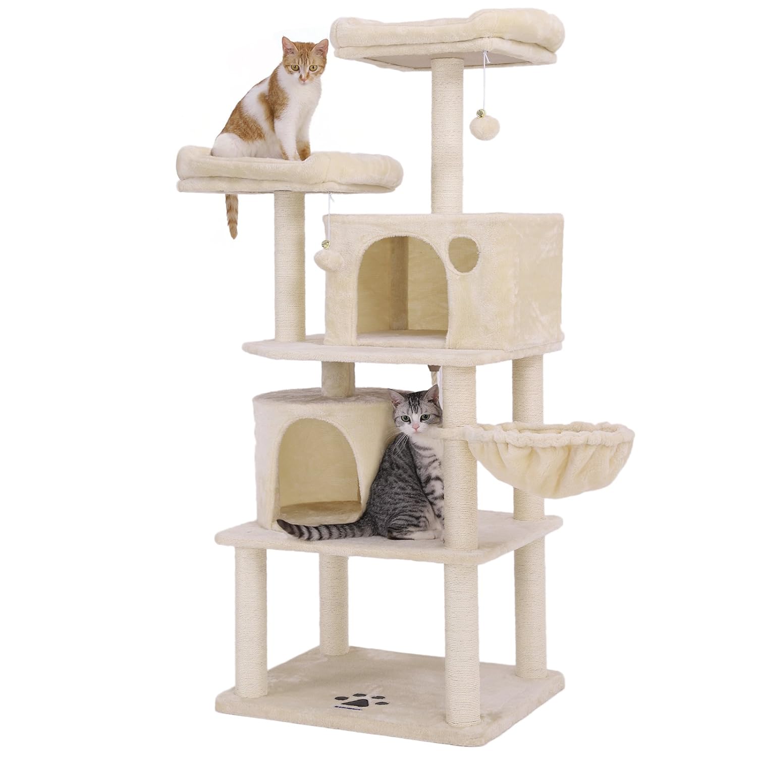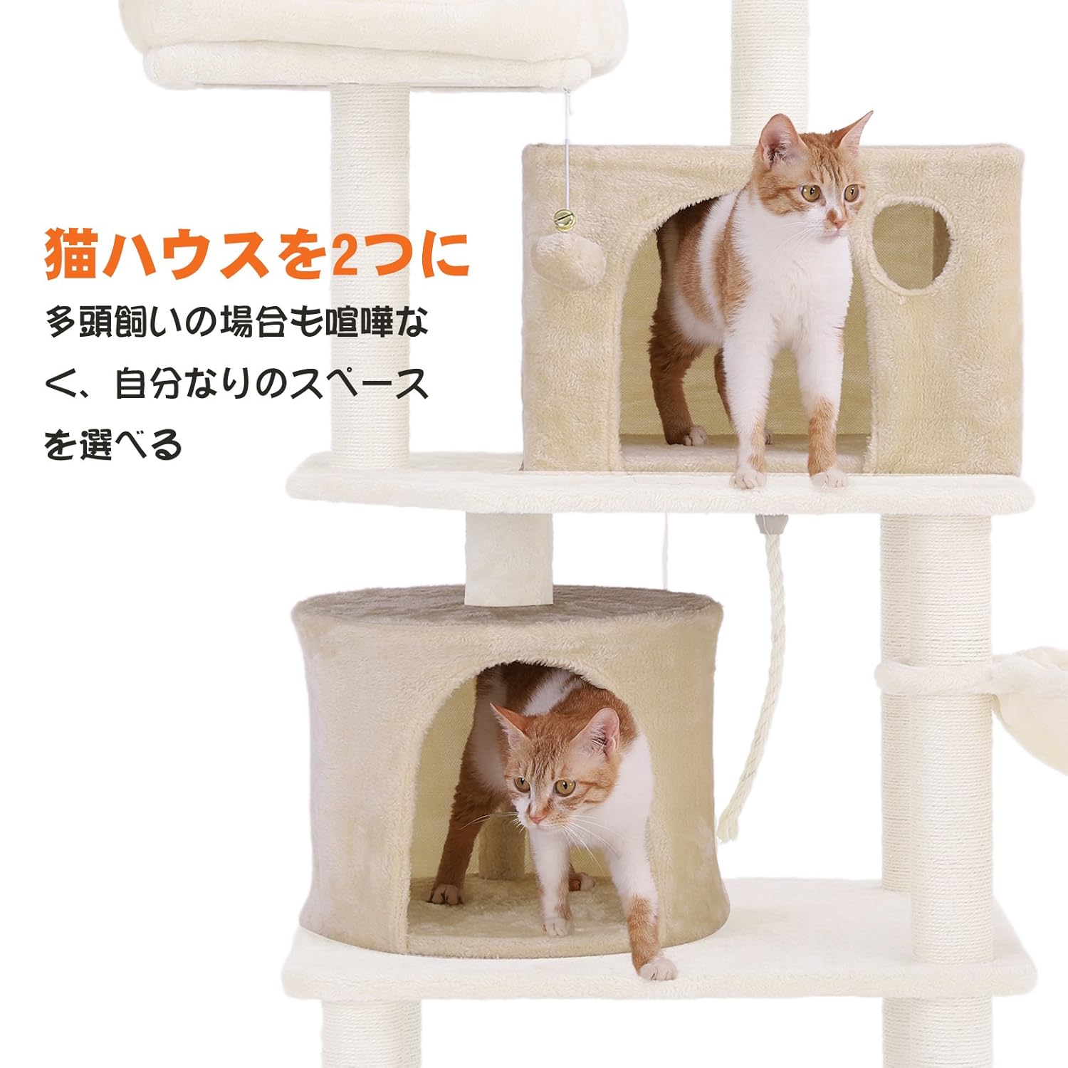 【猫ハウス二つ】狭いところが好きな猫ちゃんにとって、いつでもくつろげる自分なりの隠れ家は欠かせないです。本キャットタワーは猫ハウスを二つデザインしており、寝る場所を自由に選べます