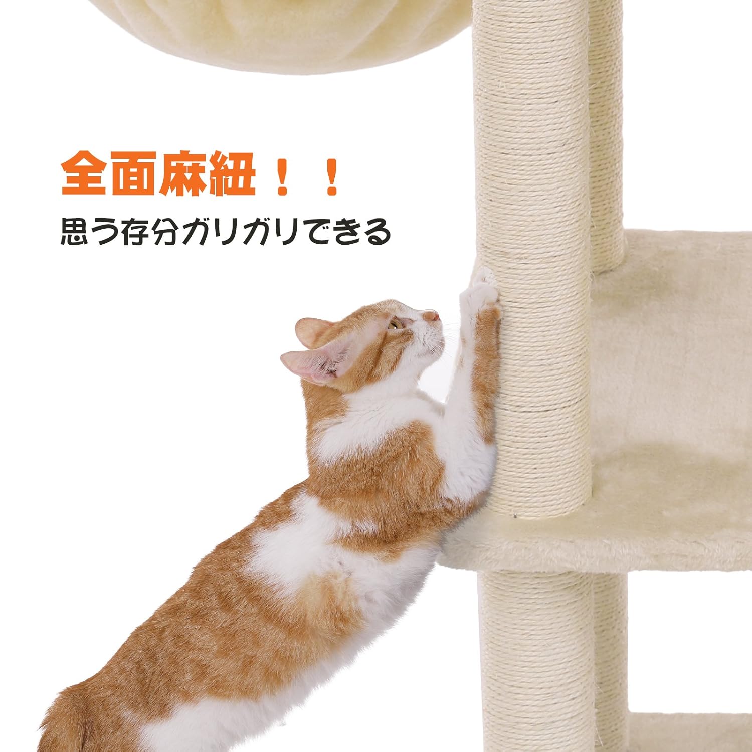 【全面麻紐仕様】元気いっぱいの子のために全面麻紐キャットタワーを設計しました。天然サイザル麻紐が靱性に優れ、思う存分ガリガリしても爪を傷けず、猫ちゃんの成長と共に長持ちできます