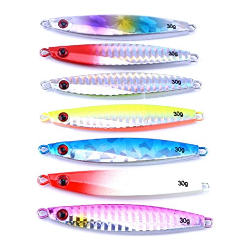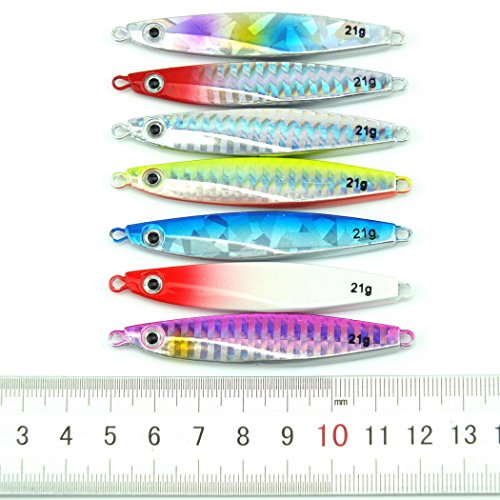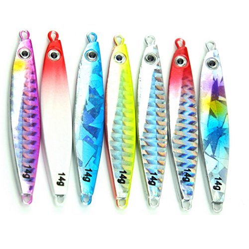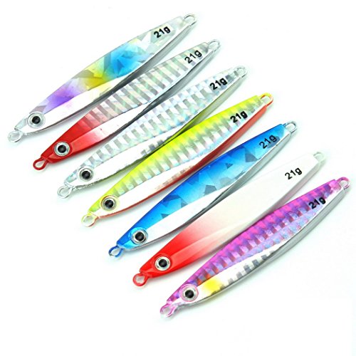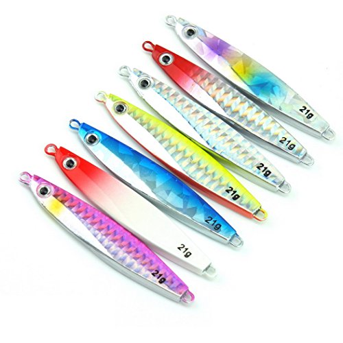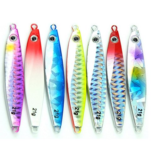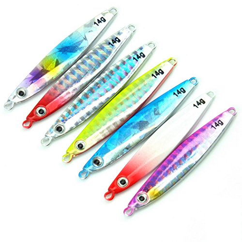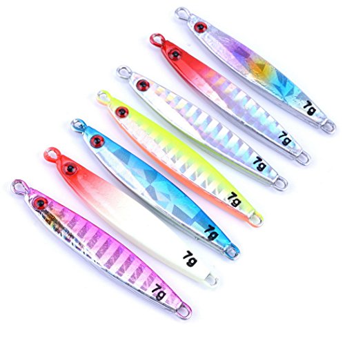 -. Binding : Misc. -. Brand : Aorace -. Color : Multicolor -. Feature : not come with split rings and hooks / Nice holographic reflection and long casting metal lure / Finished with 3D eyes and a high-quality finish, the Jigging Spoon gets fish to strike with a methodic jigging action or on a straight retrieve / Catches a Wide Range of Saltwater and Freshwater Fish / Applies to all kinds of fish, trout perch perch carp trout chub -. Label : Aorace -. Manufacturer : Aorace -. PackageQuantity : 1 -. ProductGroup : Sports -. ProductTypeName : SPORTING_GOODS -. Publisher : Aorace -. Studio : Aorace -. Title : Aorace 7pcs/lot Small Shore Cast Iron Metal Glow Lures Bait Iron Jigs Saltwater Road Sub Slow lure fishing Jigjing