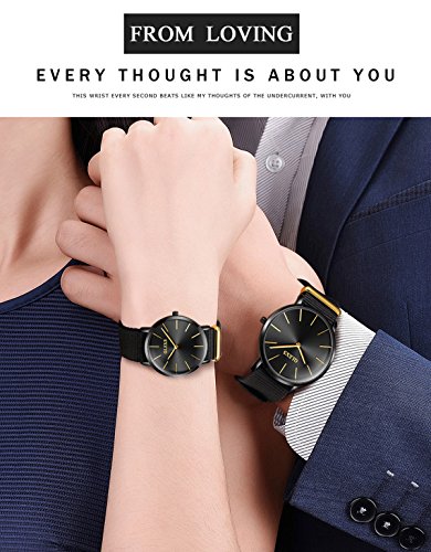 -. Feature : Watch Attributes: Pure black dial and black canvas band matching set couple watches, black and gold tone.Japan movement and waterproof 30m / Watch Specification: Man standard and women standard, ultra thin watchcase:6.5mm. For more detail refer for the picture. / Canvas Couple Wrist Watch: This model of watch is design with pure black canvas and black dial, simple and cool color. Combine with gold pointer and number, which display your noble temperament. This watch is no only a watch ,it express your taste and style. As you could feeling, the overall feeling of this watch is simple and clear. I love it for a big face, clear watch dial and pure black band. / Casual and Business Watch: Black is a easy collocated in any clothes, you could wear it with lazy T-shirt in a weekend. and you also could regard it as a business wrist watch with your suit. Which will attractive people eye. Why we design it as a couple match set. how special it is! A couple watch mean miss your love oneat every moment, it like a feel that you always be with her/ his, so romantic,isn't it? / *WRAP: with a exquisite box, it could be as a gift to your lover directly