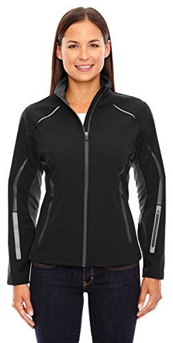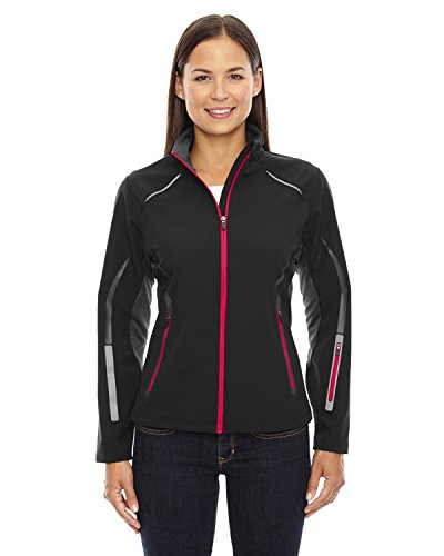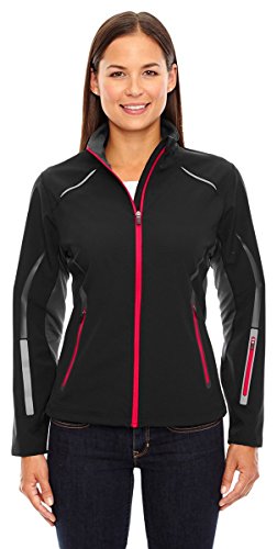 Binding : Apparel Product Description North End Sport Red Pursuit Ladies' 3-Layer Light Bonded Hybrid Soft Shell Jacket, INSERTS: 96% polyester/4% spandex terry, 4% spandex bonded with 100% polyester jersey, 7.4 oz./yd2/250gsm, 8,000 mm waterproofness, 800 g breathability, 96% polyester/4% spandex bonded with 100% polyester jersey, 7.4 oz./yd2/250gsm, inside storm placket with chin guard, front reverse coil zipper with semi-autolock rubber pull tab, front reverse coil zippered laser cut pockets, left sleeve reverse coil zipper laser cut pocket, reflective piping at front and back shoulder yoke, laser perforation at upper back for added breathability, reflective heat transfer decoration at lower sleeves, audioport access through inside left pocket, adjustable shockcord at hem, Sizes: XS-2XL. 0