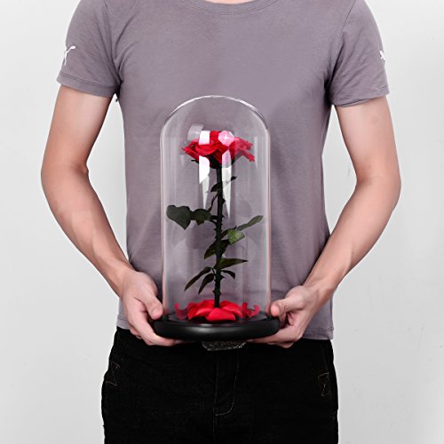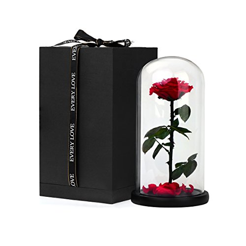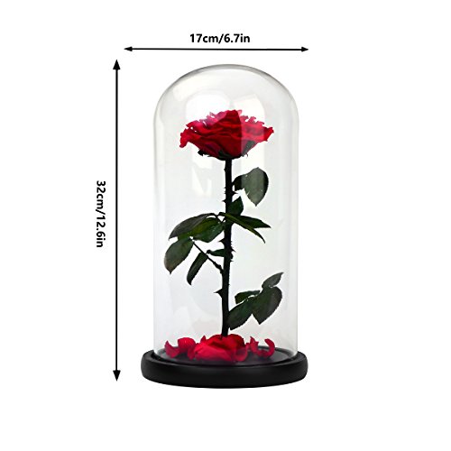 DeFancy Preserved Real Rose with Fallen Petals in Glass Cloche Dome with Black Wood Base-Best Gift Jar