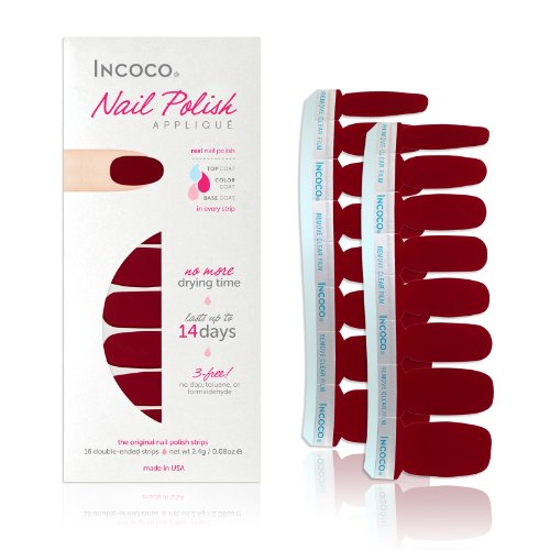 -. Binding : Misc. -. Brand : Incoco -. Color : Red -. Feature : No more dry time, smears or smudges; Get salon quality results in minutes right at home / Made with real nail polish, Easy to apply, Lasts up to 14 days, Removes easily with nail polish remover / Includes 2 sheets with 16 total strips in varying sizes to ensure a perfect fit / A wide variety of colors and finishes; Mix and Match to create your own unique look / Get the perfect design manicure every time -. Label : Incoco -. Manufacturer : Incoco -. MPN : EMC005 -. PackageQuantity : 1 -. PartNumber : EMC005 -. ProductGroup : Beauty -. ProductTypeName : BEAUTY -. Publisher : Incoco -. Studio : Incoco -. Title : Incoco Nail Polish Strips, Nail Color, Red Velvet