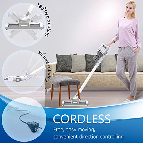Cordless:The cordless feature allows you to move anywhere to clean freely.180 degree rotation of the head allows you to get into those hard to reach places,2200 mAH Removable battery for easier charging.After full charge (4-5 hours) it will give you 40 minutes uninterrupted cleaning when on quiet mode and up to 25 minutes when using at full power.