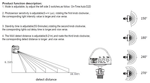 - NEWLY IMPROVED MOTION SENSOR DESIGN: 180° Sensing Angle, Adjustable Detection Range, Photosensor Sensitivity, On-Time Duration, Dusk-to-Dawn Mode, and Always On Mode!