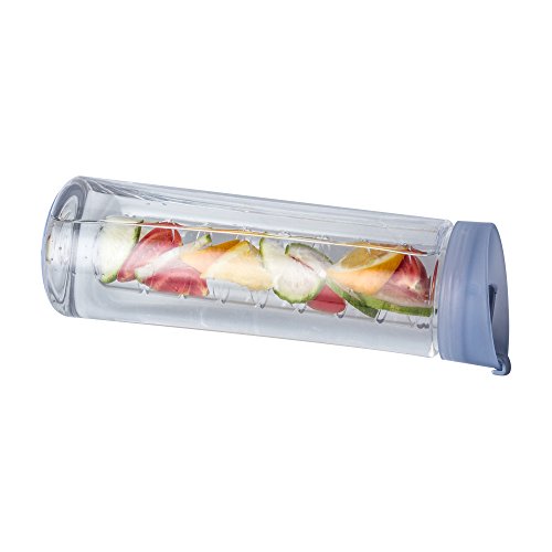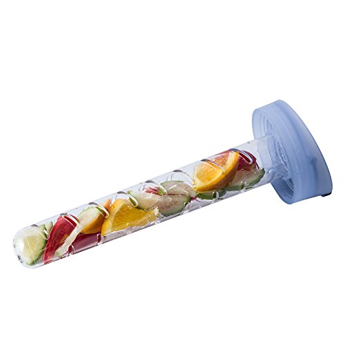 LARGE FRUIT INFUSED WATER BOTTLE:25 oz Large capacity infusion beverage container with 1 removable fruit infuser insert tube and wide mouth is easy to fill with fruit,just bought some kiwi, strawberries, cucumber, and some frozen mixed berries to try. It's super portable.Size:9.8*3inch.