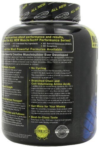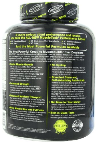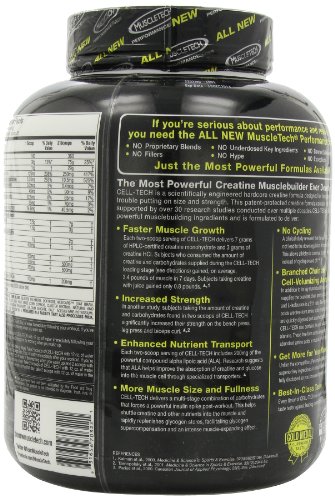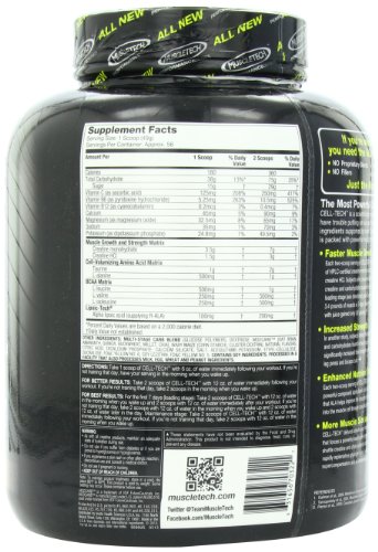 Studio : MuscleTech Publisher : MuscleTech Binding : Health and Beauty Product Description Each two-scoop serving of CellTech micronized creatine powder delivers 7g of HPLC-certified creatine monohydrate and 3 grams of creatine HCl. This dose of creatine is far higher than most creatine products, and yet those creatine products don't utilize a delivery system! CellTech creatine powder delivers a multi-stage combination of carbohydrates, including glucose polymers, dextrose, ModCarb (oat bran, quinoa, buckwheat, millet), waxy maize and highly branched cyclic dextrin totaling 75g per two scoops. After each max serving of CellTech, insulin levels rapidly peak in the bloodstream, priming muscles for maximum creatine hyper saturation and retention. CellTech creatine powder is a true third generation creatine formula that harnesses the anabolic power of insulin and is so powerful that it has not only stood the test of time, but has become legendary for its ability to pack on mass, size and strength like no other creatine formula before or since. 0