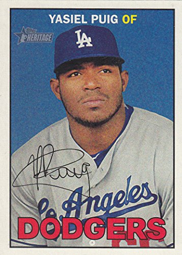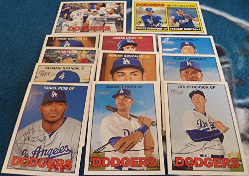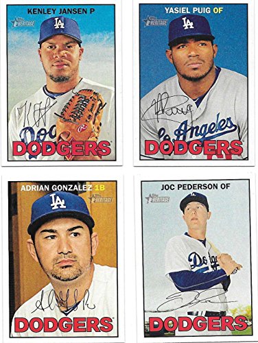 Los Angeles Dodgers 2016 Topps Heritage Baseball complete mint basic 12 card team set; it was never issued in factory form. Cards included are Yasiel Puig, Kenley Jansen, Chase Utley, Justin Turner, J.P. Howell, Jimmy Rollins, Joc Pederson, Yasmani Grandal, Adrian Gonzalez, Andre Ethier, a Dodgers Rookie Stars card featuring Trayce Thompson and Frankie Montas and a Dodgers team card.
