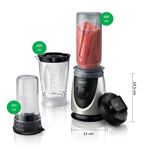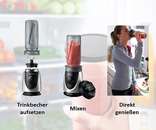 -. Feature : Mit dem Philips Mini Standmixer können Sie leckere Smoothies, Mixgetränke, Suppen, Dips und Cocktails zubereiten. / Inkl. praktischer Trinkflasche zum Mitnehmen, so dass Sie Ihre Smoothies und frisch gemixten Säfte auch unterwegs genießen können. / Mit Zerkleinerer für die Verarbeitung von Gemüse, Kräutern und Nüssen. / Der Mixbecher aus Kunststoff ist verstärkt, um Bruchschäden zu vermeiden. / Einfache und wirksame Reinigung dank abnehmbarer Messereinheit. / Lieferumfang: Mixer mit Mixbecher (600m l), Zerkleinerer (350 ml), Trinkflasche (600ml), Bedienungsanleitung; Garantiekarte