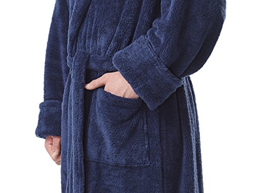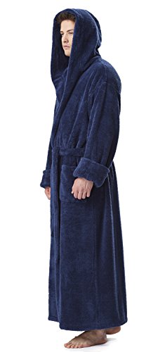 Arus Men's Fleece Robe, Long Hooded Turkish Bathrobe, Navy Blue, L/XL