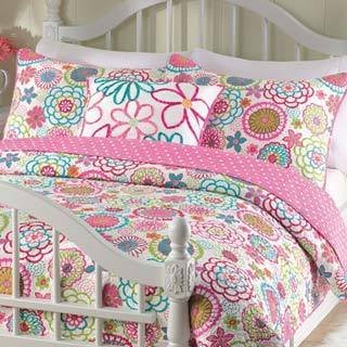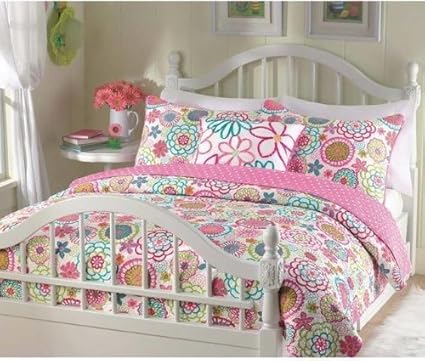 - Quilt is reversible with colorful flowers on one side and pink with polka dots on the other