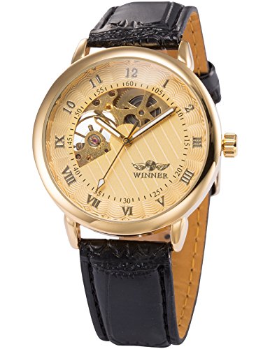 -. Title : AMPM24 Skeleton Hollow Mens Hand-winding Mechanical Golden Dial Leather Wrist Watch PMW067