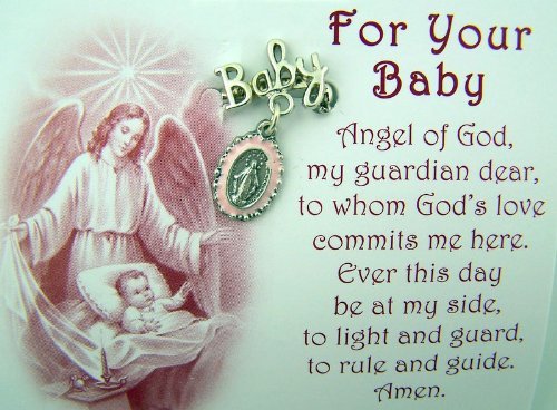 Birth or Baptism Gift "Baby" Lapel Pin with Dangling Pink Miraculous Medal Charm