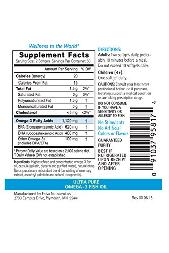 -. Binding : Health and Beauty -. Brand : Eniva -. EAN : 0091037958174 -. Feature : The Omega-3s in EFACOR Have Been Shown to Support: Cardiovascular Health - Neurologic Health and Mood - Immune and Joint Health - Vision and Ocular Health -Healthy Weight and Skin. / Omega-3 Supplement of Essential Fatty Acids - Concentrated EPA and DHA. / The natural lemon flavor of these Omega-3 oil tablets offers a light refreshing taste. / No Artificial Colors or Flavors - No Sugars - No Stimulants. / Directions:Two softgels daily, preferably 10 minutes before a meal. Do not exceed 10 softgels daily. Children (4+): One softgel daily. Recommendations: May Combine with 8 ounces of water/ juice. -. IsAdultProduct : 0 -. Label : Eniva USA -. Manufacturer : Eniva USA -. PackageQuantity : 1 -. ProductGroup : Health and Beauty -. ProductTypeName : HEALTH_PERSONAL_CARE -. Publisher : Eniva USA -. Studio : Eniva USA -. Title : Eniva Omega 3 High EPA/DHA Premium EFACOR Fish Oil Lemon Flavored (120 caps) -. UPC : 091037958174