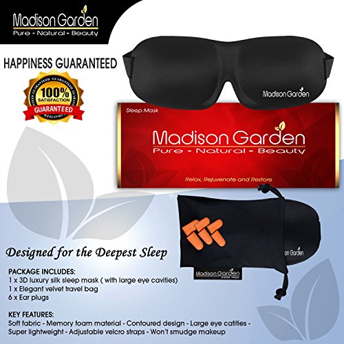 -. Title : Sleep Mask by MADISON GARDEN - Eye Mask for Sleeping Deeper, Contoured & Adjustable Strap Eyemask, Silk Blindfold with Ear Plugs Travel Pouch, Men Women Kids, Insomnia Aid Light Blocking Eyeshade