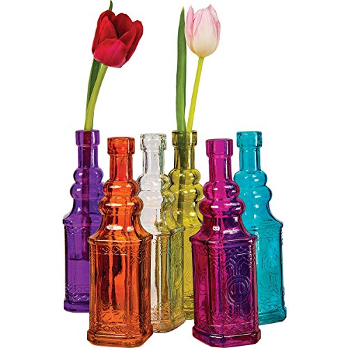 Luna Bazaar Small Vintage Glass Bottle Set (7-Inch, Ella Design, Multicolor Glass, Set of 6) - Flower Bud Vases Bulk - For Home Decor and Wedding Centerpieces