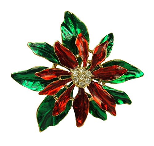 The holidays will be here before you know it. Brighten them with this elegant, beautifully made and cheerful poinsettia pin that also has a loop on the back. Thread a ribbon or cord through the loop and you can hang the poinsettia on your tree. Or add a chain so you can wear it as a pendant. About 1 7/8 inches long overall and 2 1/4 inches wide. Pin back with safety C clasp. Made in China. Not for children 12 and under.