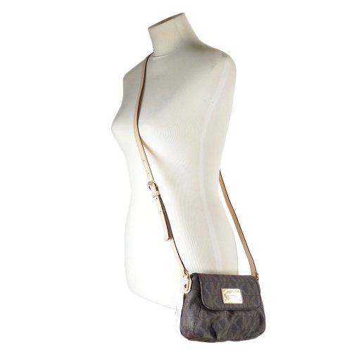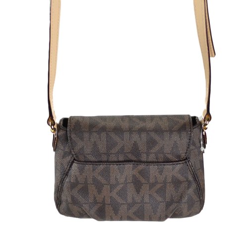 - Feature : Brown MK signature logo patterned PVC with tan leather trim and golden tone hardware / Lined interior with open slip pocket / Flap top with magnetic closure; open slip pocket on the back / Single adjustable tan leather shoulder / cross-body strap; drop of 22 - 24" / Measures approximately 7" x 5" (H) x 2.5" (W)
