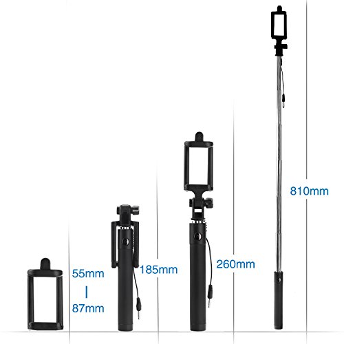 - Feature : The most popular and fashion selfie stick for iPhone, Samsung and other popular smartphones / 270-degree rotary joint ensures you the best and beautiful angles for photo or video shoots / Perfect size with foldable & portable design allows you keeping in your bag or pocket easily wherever you go. The monopod can be extended from 7.41" to 28.74" inches (18.8-73cm) capture every unforgettable moment. / Specially designed in U-Shape and reliable anti-skid rubber to hold your smartphones more tightly & secure, it also comes with extra wrist strap would be provided as well to prevent accidental falling. / This is wired-type not Bluetooth connected, so you'll be released from endless charging . Just plug it into the audio jack and start enjoying selfie. (Note: For smartphones supported by Android system you might need to change the settings of your camera firstly, set the function of Volume Keys to Photo-shooting).