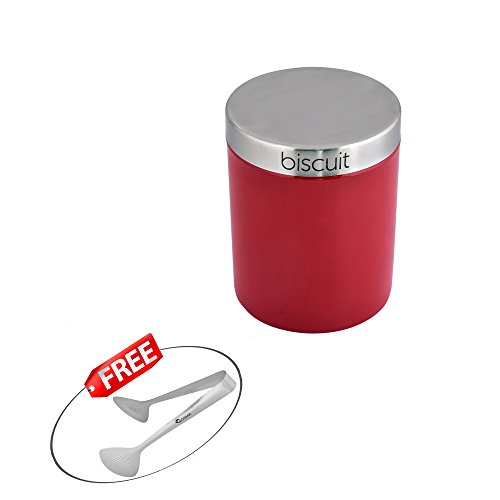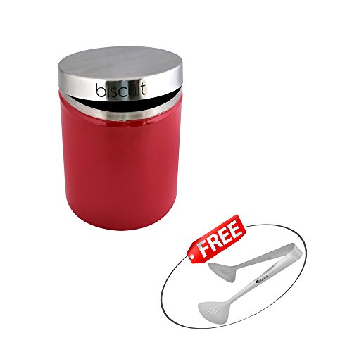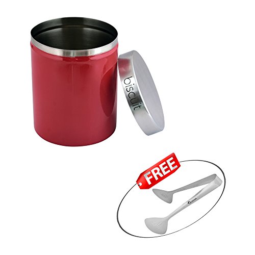 Kosma Stainless Steel Biscuit Bin | Buscuit Canister | Kitchen Storage Jar in Vibrant Red Colour with "FREE" Serving Tong - Size: 17 x 14 cm
