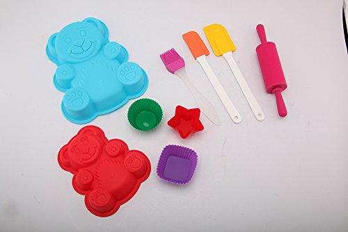 - Set comes with 1 spatula, 1 pastry brush, 1 mixing spatula, 1 medium size silicone teddy bear mold, 1 large size silicone teddy bear mold, 3 different shape silicone baking cups, 1 rolling pin and 1 whisk.
