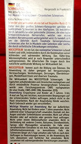 -. Feature : Schnelle Linderung von nozizeptiven Schmerzen aufgrund der wärmenden und kühlenden Wirkung / Nociceptol ist ein Schmerzgel mit ätherischen Ölen / Hemmt zudem die Bildung von Ödemen. Die Anwendung ist daher geeignet bei Verspannungen, Verstauchungen, Verdrehungen, Zerrungen, Überdehnungen, Muskelfaserrissen und diversen Traumata / Lindern Muskel-, Gelenk- und Arthritische Schmerzen