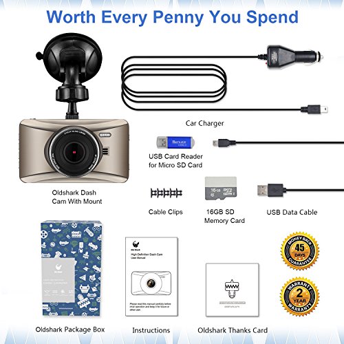 ¡¾What you get¡¿OldShark G13 Car DVR Recorder, 16GB micro SD card, car charger, USB cable, bracket, user manual. OldShark provide 45 Days Money Back Guarantee, 18-month warranty and professional after-sale service.