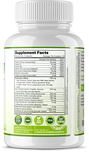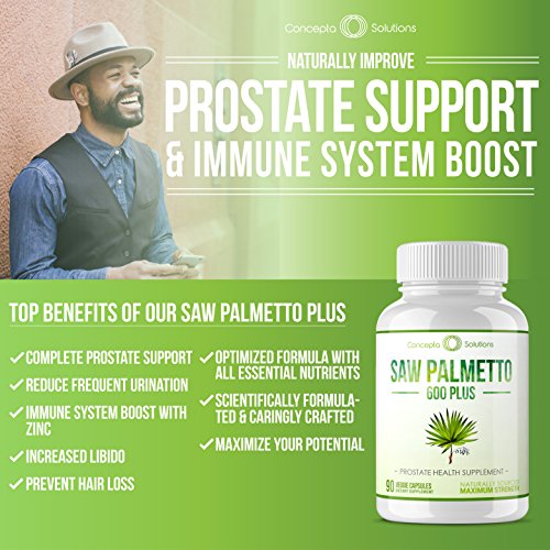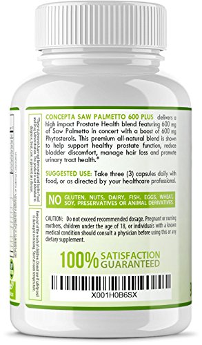 -. Feature : ★ AN UNINTERRUPTED NIGHT'S SLEEP - Imagine a full night's sleep, uninterrupted by frequent bathroom breaks? Looking to boost your quality of life? Concepta's Saw Palmetto 600 Plus is the premium solution for your prostate strles. Whether it's a weak or slow urinary flow, or the urgent need to release, these are issues you can put behind you, even as you age! Take charge of your life and your rest with our natural and maximum strength formula.* / ★ MANAGE HAIR GROWTH - We get it. Hair loss is all too common, and often comes in tandem with prostate malfunction. So don't worry; research has shown that Saw Palmetto is one of the most effective herbal supplements in maintaining healthy hair growth by blocking harmful levels of DHT, the molecule responsible for hair loss.* / ★ NON-GMO & VEGAN FRIENDLY - Our formula contains ZERO fillers, preservatives, chemicals, sugar, gluten, wheat, dairy, and is Non-GMO We've built a proudly American company with an FDA-certified laboratory, meeting the highest cGMP industry standards. Each of our products is stringently third-party tested to certify that every bottle contains what it says it does. / ★ HEALTHY PROSTATE, HAPPY LIFE - Our formula is the only prostate support offering a whopping 600 mg of Saw Palmetto, in both Extract and Powder form. This unique combination supports prostate health and urinary tract function. And the "PLUS" in our unique formulation refers to our added boost of Quercetin, Lycopene, Stinging Nettle Extract and no less than 600 mg of a proP.R.Ietary Sterol Blend (Beta Sitosterol and Phytosterols) which studies have demonstrated can help reduce prostate issues.* / ★ 100% SATISFACTION GUARANTEED - We're so confident that Concepta's Saw Palmetto 600 Plus will meet your satisfaction, we're taking all the risk with our Satisfaction Guarantee! Try our trusted formula for as long as it takes - If you're not satisfied, just let us know & you will receive a full refund, no questions asked, no hassles! So, what do you have to lose?