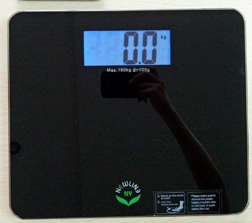 -. Feature : Round edges for comfort and safe in your bathroom; sleek NewlineNY Neat & Thin design / Eco large 4.3 inches LCD with blue backlight for easy and better reading / Step-on Technology, no need to tap for activation. Step on the scale and get instant readings. / Unit switch: the scale can display in Kg, Lb or St., Consistent and accurate measurements up to 400 lb. or 180 kg; Graduation increments of 0.2 lb./0.1 kg. / Non-slip feet will not scratch floors. Scale must be placed on flat, level & hard floor for accurate weight; Available in 5 colors: Black, White, Red, Green & Dot Wave
