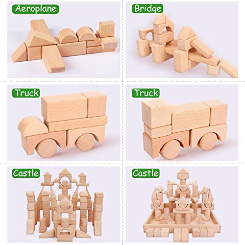 Beneficial to All Ages : Inspiring classic creativity and improving dexterity, the classic wooden block set and carry case includes 13 different shapes for your children to build to their heart's content. Their imagination will run wild creating unique masterpieces with the variety of shapes, each the perfect size for children to handle: square, rectangle, circle, half-circle, triangle, cylinder, arch, and more! The toy also can serve as "a communication tool" for the young and old!