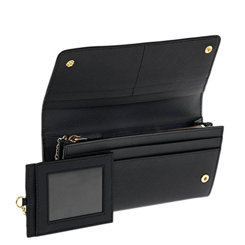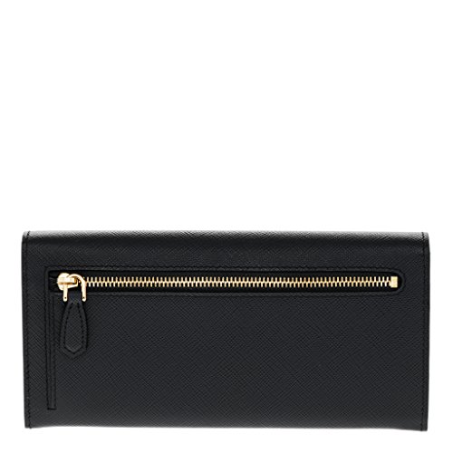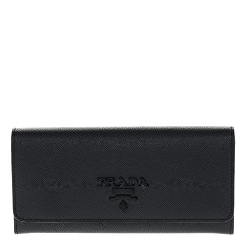 Binding : Apparel Product Description Prada Womena€TMs Large Saffiano Leather Wallet Black: Saffiano leather. Snap closure. Ten credit card slots. Coin compartment with zipper closure. Pocket outside with zipper closure. Four document and bill compartments. Removable badge holder with two credit card holder. Made in Italy. Approximately: 3.8a€ H x 7.2a€ W x .5a€ D. 0