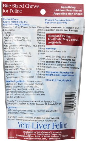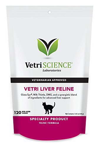 -. Binding : Misc. -. Brand : VetriScience Laboratories -. Department : cat-digestive-urinary -. EAN : 0026664279217 -. Feature : A comprehensive formula designed to support liver function, detoxification, fat metabolism, bile production and methylation reactions / Gluta-Syn Whey Protein Isolate supports the production of glutathione and detoxification of the liver / Taurine is an essential amino acid for the cat and is required for normal bile acid metabolism / Packaging May Vary -. Label : Vetri-Science Laboratories -. Manufacturer : Vetri-Science Laboratories -. Model : 0900792.120 -. MPN : 900792.12 -. PackageQuantity : 1 -. PartNumber : 900792.12 -. ProductGroup : Pet Products -. ProductTypeName : PET_SUPPLIES -. Publisher : Vetri-Science Laboratories -. Size : 120 count -. Studio : Vetri-Science Laboratories -. Title : Vetri-Liver Feline, 120 Bite-Sized Chews -. UPC : 026664279217