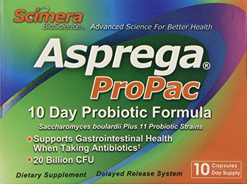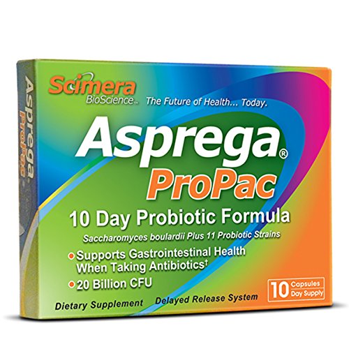 ReleaseDate : 2015-06-22 Studio : Scimera BioScience Publisher : Scimera BioScience Binding : Health and Beauty Product Description This convenient 10-day course of Scimera BioScience's powerful, broad-spectrum probiotic, Asprega, was developed specifically to support gastrointestinal health when taking antibiotics. Clinical research suggests the use of probiotics may reduce the onset of antibiotic associated diarrhea. Asprega ProPac's smart packaging approach provides just the right amount of capsules to last a typical 10-day regimen of antibiotics - with no waste and at a much lower price than most full-size packages of probiotics. 0