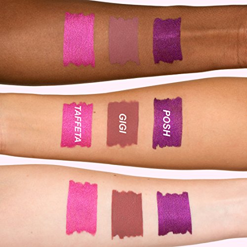 FUSCIA VELVE-TIN. This sassy collection comes with three gorgeous hues. TAFFETA (metallic fuchsia) GIGI (matte taupe mauve) and POSH (metallic plum). These lipsticks glide on smooth and are perfectly kissable for a mix between class and sass.