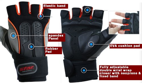 -. Feature : Long wrist straps for wrist support / High density EVA cushions in palm / Comfortable spandex panel & Durable rubber pad, Light weight / Fully adjustable double wrist closer with neoprene & fixed band / increase grip power