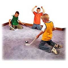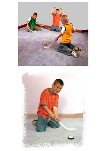 Product Description Mini Carpet Hockey! Develop your hockey skills and strategy with Mini Carpet Hockey. For lots of fun and fast action, play Mini Carpet Hockey safely indoors on carpet with your friends. The Carpet Puck has an ultra-smooth base that glides over any type of carpet and soft foam cleanly bounces off walls and basboards. Features: Two 16" Sticks and 1 Carpet Puck.