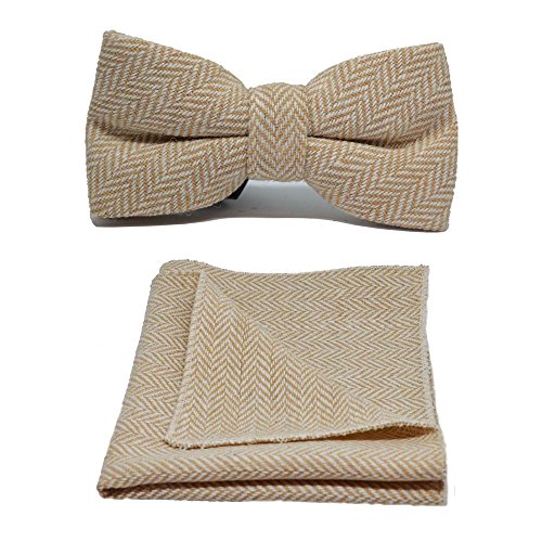 Gorgeous gold and cream bow tie and pocket square set in a premium, soft Herringbone fabric. Bow tie is adjustable to a neck size of up to 19" with metal hook eye fastening. Pocket Square measures approximately 25cm x 25cm. Forms part of the King Priory Herringbone Collection. Matching tie also available. 0