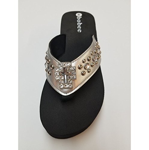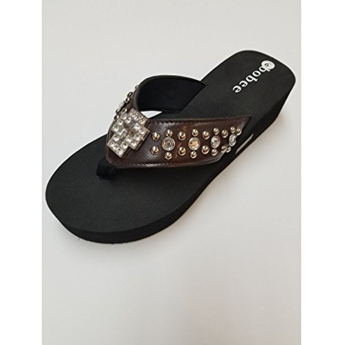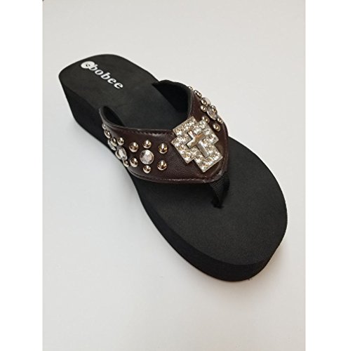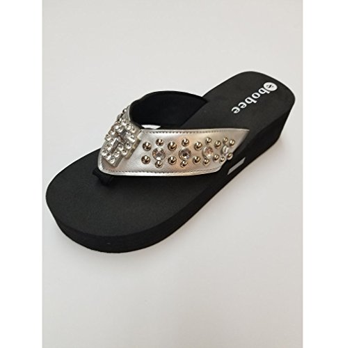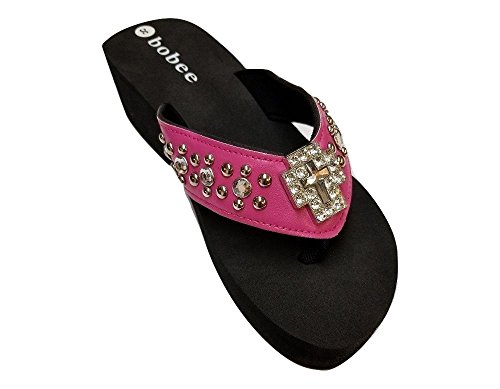 Binding : Apparel Product Description Women's 2.25" Cross Rhinestone Studded Platform Beach Thong Flip Flop Sandals. Express your own style with these lovely sandals that feature a cross in the middle of the straps surrounded by rhinestone accents all around. Finished off with metal studs and more rhinestones throughout the rest of the strap. The platform measures 2.25" inches in height. These will make a great pair of summer sandals great for any occasion. They will complement any outfit. They are available in three different colors: brown, fuchsia, and silver. Please measure your feet and compare them with our measurements to select the best size that will fit you. The measurements are as follows: Size 5 Length 23.5cm Width 9cm Size 6 Length 24cm Width 9cm Size 7 Length 25cm Width 9.5cm Size 8 Length 25.5cm Width 9.5cm Size 9 Length 26cm Width 10cm Size 10 Length 26.5cm Width 10cm 0