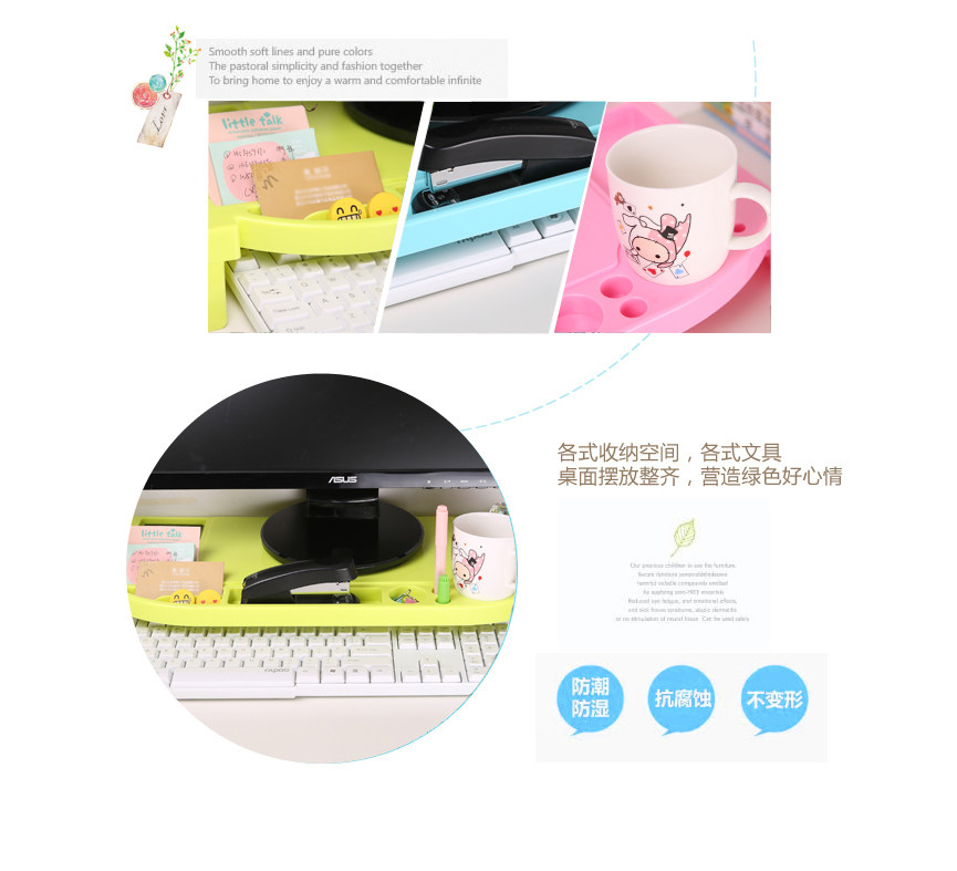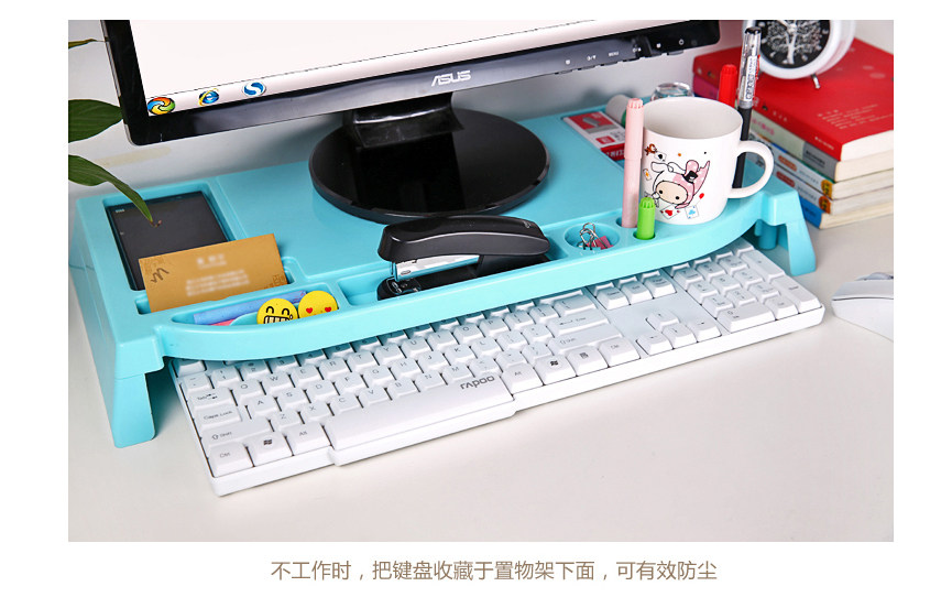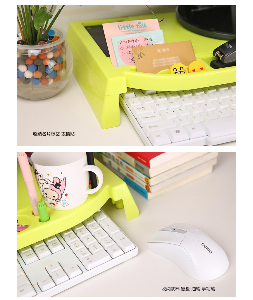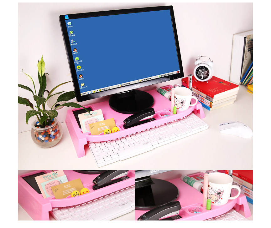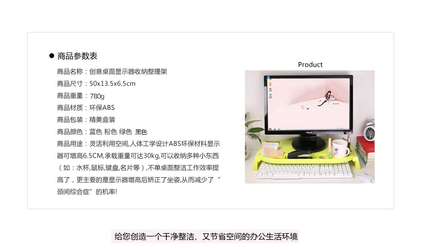 Flexible use of space, ergonomic design, ABS environmental protection material, the display may increase 6.5cm, load capacity up to 30KG, can incorporate a variety of small things (such as cups, mouse, keyboard, business cards, pens, etc.), not a tidy desk productivity improved, but the main thing is to monitor increased after corrected posture, thereby reducing & amp; amp; ldquo; neck syndrome & amp; amp; rdquo; chance.