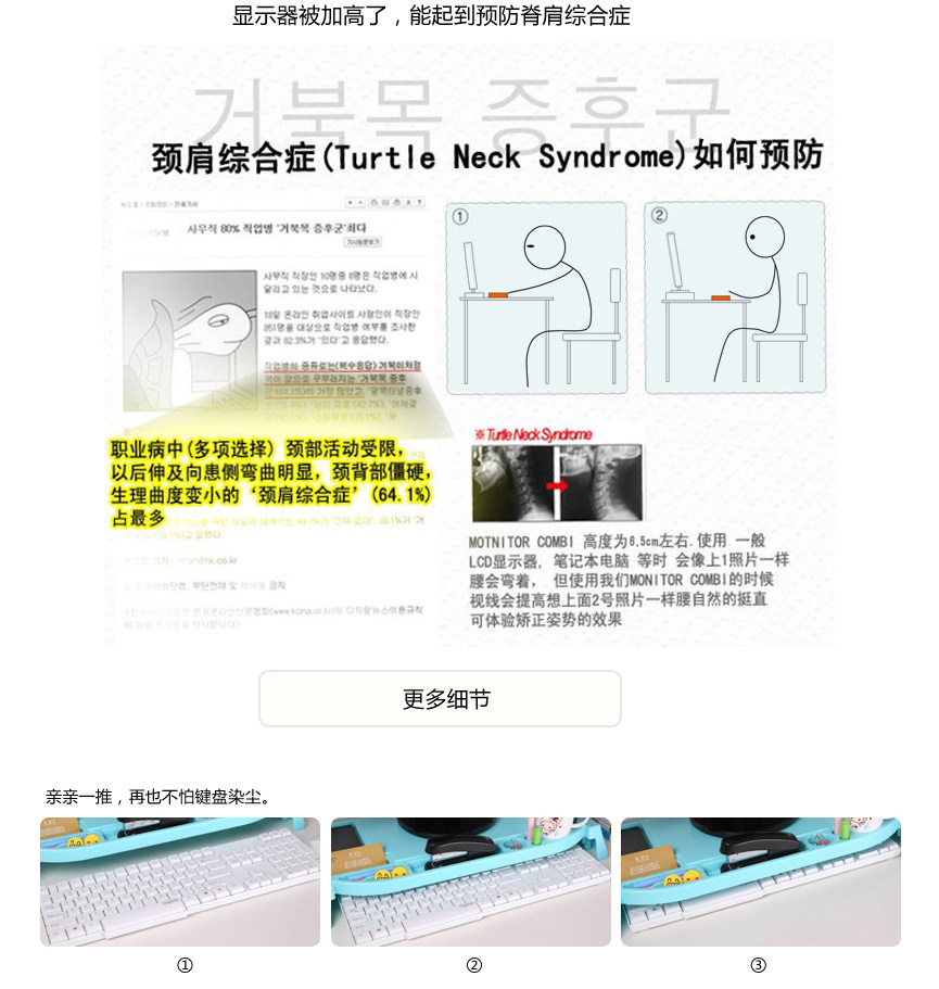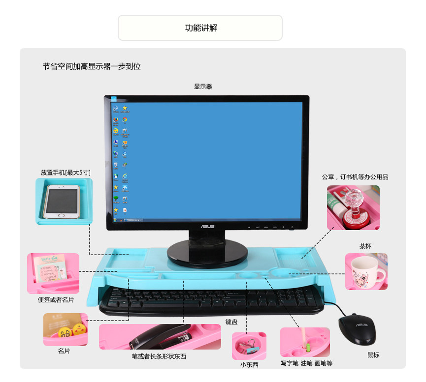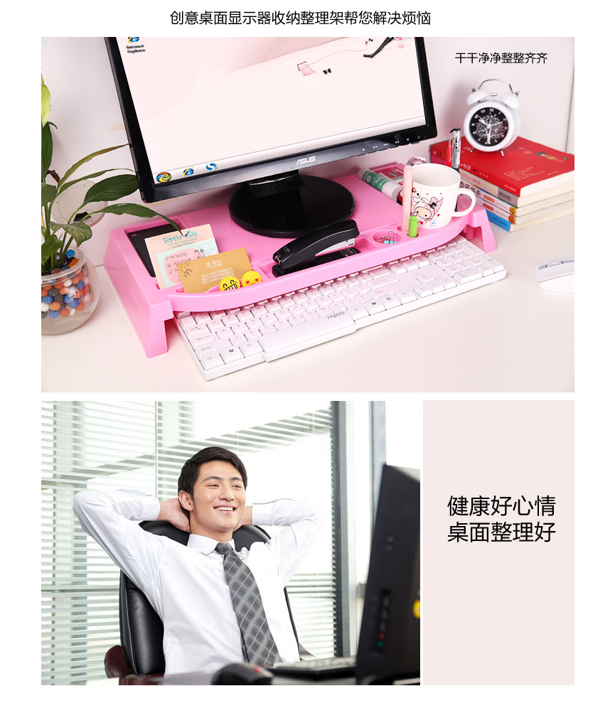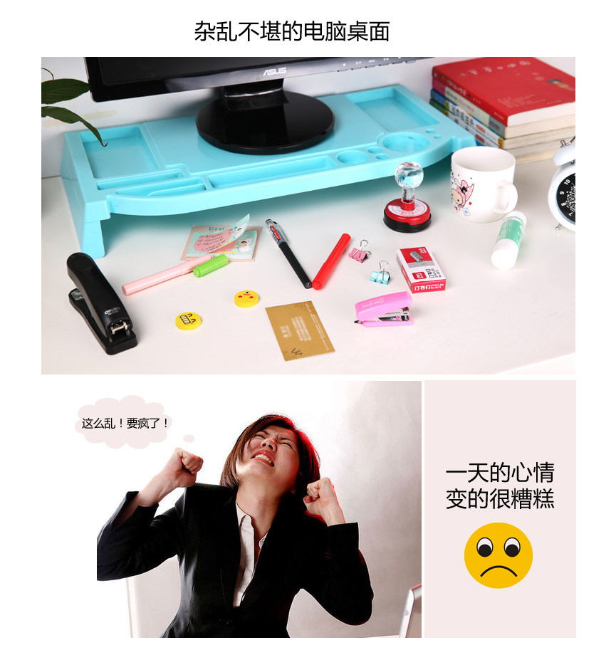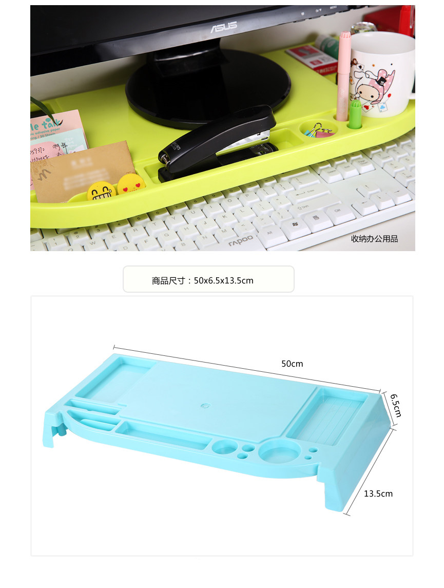 Flexible use of space, ergonomic design, ABS environmental protection material, the display may increase 6.5cm, load capacity up to 30KG, can incorporate a variety of small things (such as cups, mouse, keyboard, business cards, pens, etc.), not a tidy desk productivity improved, but the main thing is to monitor increased after corrected posture, thereby reducing & amp; amp; ldquo; neck syndrome & amp; amp; rdquo; chance.