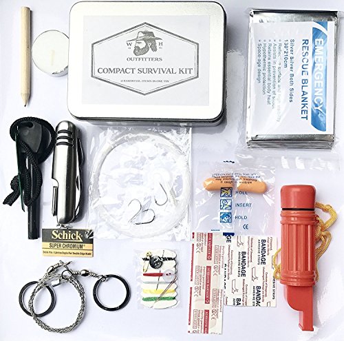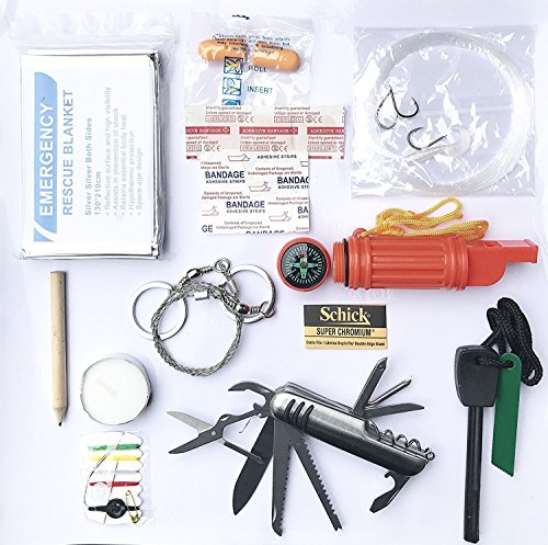 - Includes Multifunction Knife, Compass/Whistle, Firestarter, Emergency Blanket, Wire Saw and More