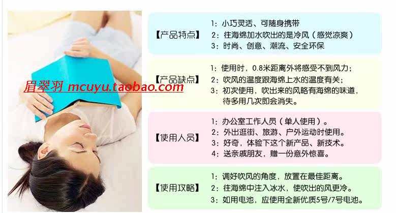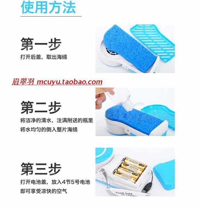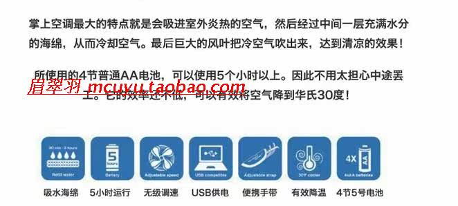 The new listing soon, adopts the effective water evaporative cooling technology is unique, only need to add water to activate the cooling function, only uses 4 AA batteries, can easily enjoy the cool air the little guy blowing moist, time can be used for more than 5 hours. Therefore do not worry about strike in the middle.
