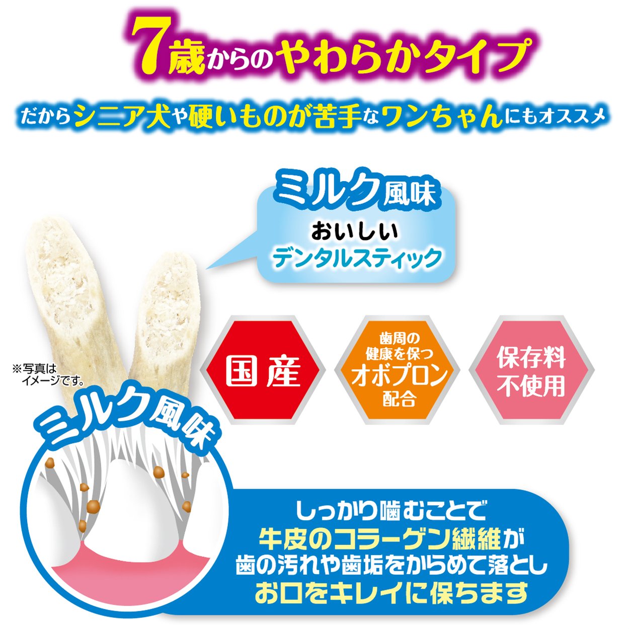 しっかり噛むことで牛皮のコラーゲン繊維が歯の汚れや歯垢をからめて落としお口をキレイに保ちます。おいしいミルク風味。歯周の健康を保つオボプロン配合。保存料不使用。