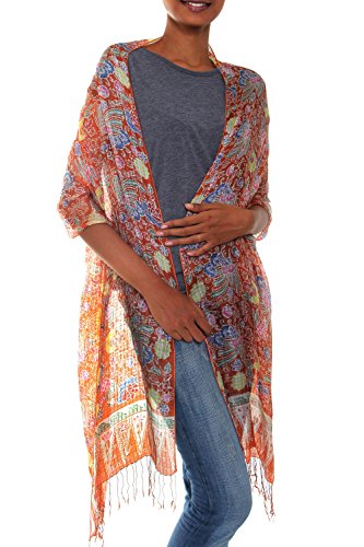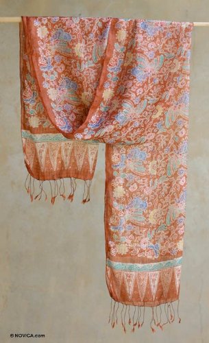 About this item: Extravagant birds of paradise flourish on a deep ginger shawl. Working in batik on silk, Yuni Kristina creates a wrap of dramatic beauty. 91.0" L x 19.5" W - Use mild detergent only