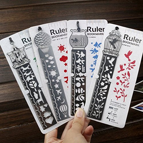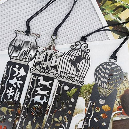 Chris-Wang 4Pack(Carousel/Birdcage/Hot Air Balloon/Fish Tank)Creative Metal Bookmark Ruler Hollow Out Mini Cute Page Finder Template Stencil with Leather String