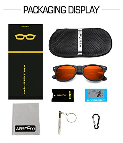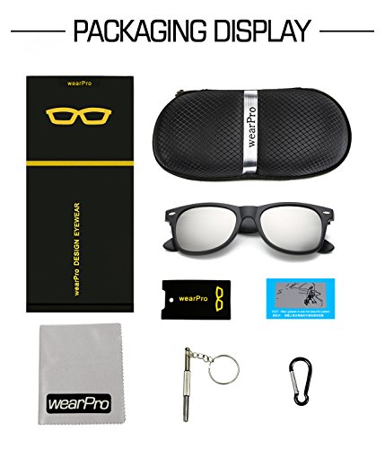 Size Lens Width:2.13inches Lens Height:1.73inches Frame Length:5.35inches Bridge Width:0.7inches Arms Length:5.4inches Package 1x Sunglasses 1x Soft Glasses Cloth 1x Spectacle Case 1x Screwdriver 1x Exquisite Packaging Carton 1x polarizing test cardboard 1x brand cardboard 1x latch catch wearPro wayfarer sunglasses for Men All wearPro sunglasses are made from first class materials. Fashionable style and first class quality is what we convey to our customers. wearPro Retro Polarized Sunglasses for men