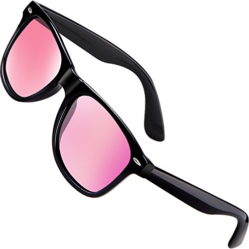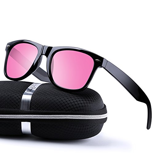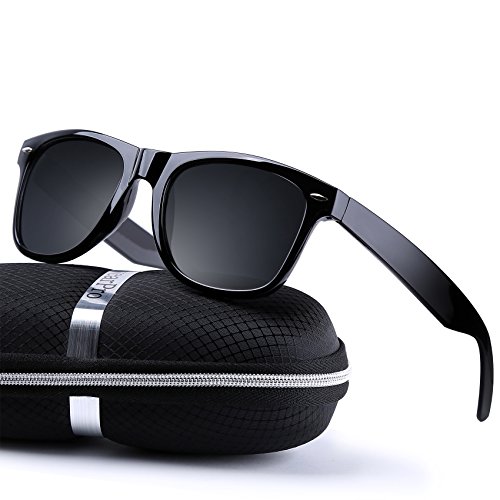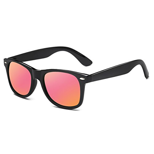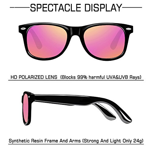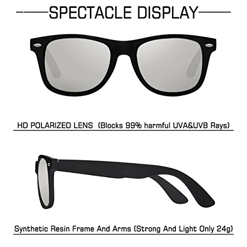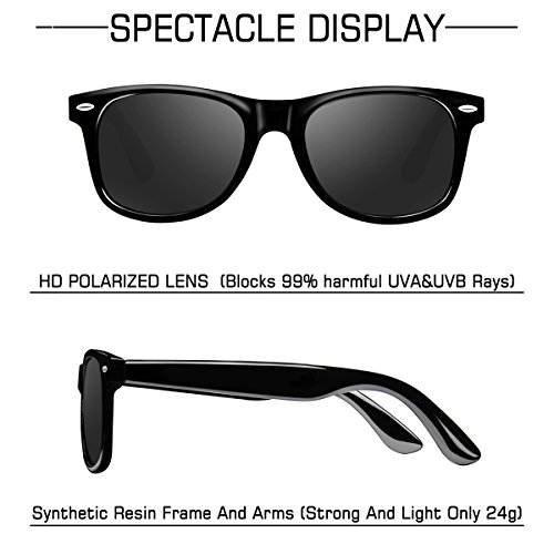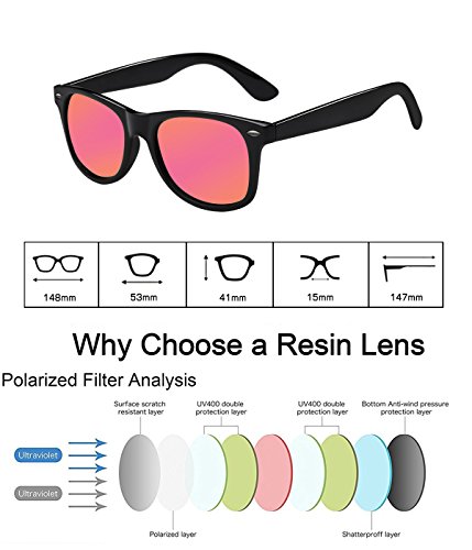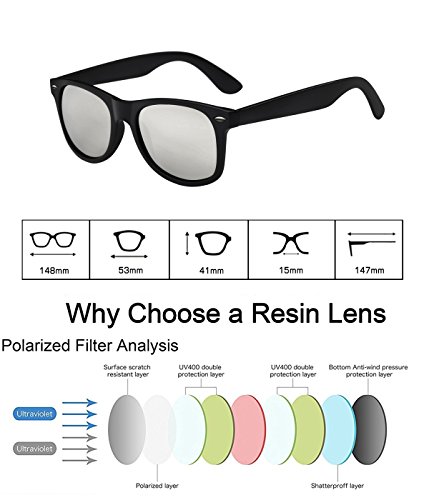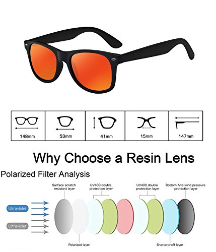 Lightweight and durable Scratch resistant Of course, the frame and nose supporter is made from skin-friendly materials. Synthetic resin frame and arms constitute a sunglasses with super light feature, just 20g that you can hardly feel them on your face and that feature enables you a long-time wearing without fatigue.? 100% UV Protection Filter out 99% of reflected glare without haze or optical distortion. Protect your eyes and enjoy a high clarity vision more comfortably. We also provide a polarizing cardboard for you to test the polarized lens of our wayfarer sunglasses.