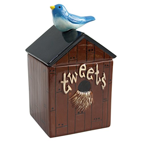 Store all of your favorite cookies in this charming birdhouse cookie jar. Made from ceramic, it is designed to resemble an old wooden birdhouse with a blue bird on top. The front of the birdhouse says the word "Tweets" to let everyone know where the treats are. Fill this jar with your favorite sweets or give to a friend with a sweet tooth as a gift.