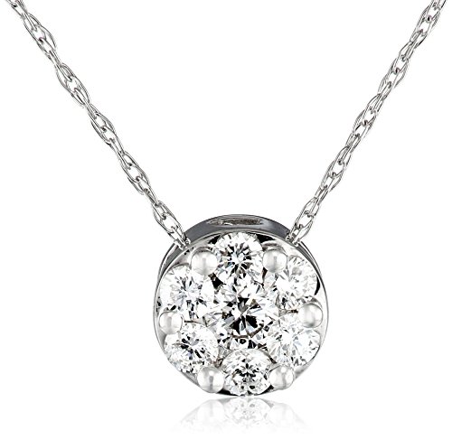-. Binding : Jewelry -. Brand : Amazon Collection -. Color : White -. Department : womens -. Feature : White gold necklace featuring circular pendant with cluster of sparkling diamond rounds / Rope chain with sP.R.Ing-ring clasp / All our diamond suppliers confirm that they comply with the Kimberley Process to ensure that their diamonds are conflict free. / Imported / Carat weight listed is the total for all stones. -. Label : Amazon Collection -. Manufacturer : Amazon Collection -. Model : 16233D2W -. MPN : 16233D2W -. PackageQuantity : 1 -. PartNumber : 16233D2W -. ProductGroup : Jewelry -. ProductTypeName : FINENECKLACEBRACELETANKLET -. Publisher : Amazon Collection -. Studio : Amazon Collection -. Title : 14k White Diamond (1/4cttw, H-I Color, I1-I2 Clarity) Cluster Chain Pendant Necklace, 18"